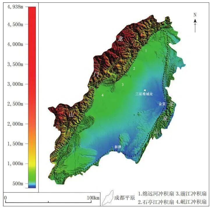 从大的自然地理空间上看,三星堆城址所在的成都平原位于龙门山与龙泉山之间,由多条河流冲积扇复合连缀而成。主要河流自北向南主要包括绵远河、石亭江、湔江、岷江等,整体地势大体自西北向东南方向倾斜。金堂、新津是成都平原主要的两个河流汇集区,地势最为低洼。具体到三星堆城址而言,其位置大体相当于上述湔江冲积扇的前缘(图一)。这一选址不仅与预防洪水关系密切,也充分考虑到了城址的水源供给(尤其地表径流)。