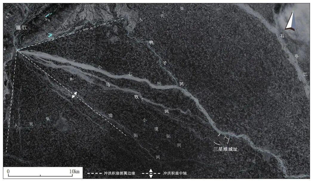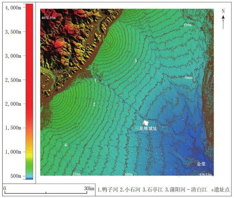 由此可见,仅从区域地貌特征上看,三星堆都城在营建之前应经过了精心选址。古蜀先民选择在湔江冲积扇前端洪积平原中部的台地上建城,不仅有意识地规避上游冲积扇洪水的直接威胁,也在一定程度上避开了容易因泄洪不畅引发洪涝灾害的河流集水区。