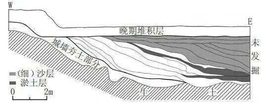 三星堆城址早晚各段城墙主要为层层堆筑而成,部分段落还可划分出明显的堆筑单元,其间或有夯打[15],墙体大多宽厚且坡度缓和。城墙不同部位的堆筑层次中常有卵石出土,可能是掏挖壕沟后进行堆土所致。同时,城墙与外侧壕沟紧邻,并且存在自沟底沿壕沟内壁向上垒筑的现象[16](图四)。由于当地汛期之时河流易发生改道、水动力强且具有较强烈的下切与侧蚀作用[17],采用上述特殊的城墙修筑方式,应有利于加固壕沟,巩固城墙墙体,并减轻水流对台地边缘的冲刷与侵蚀。