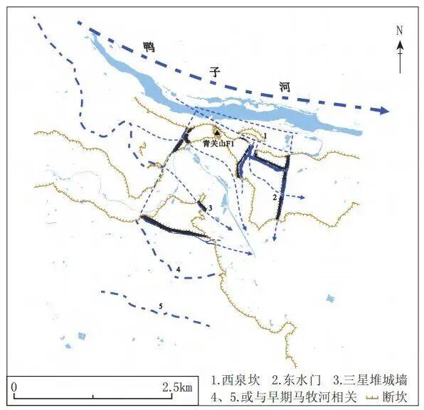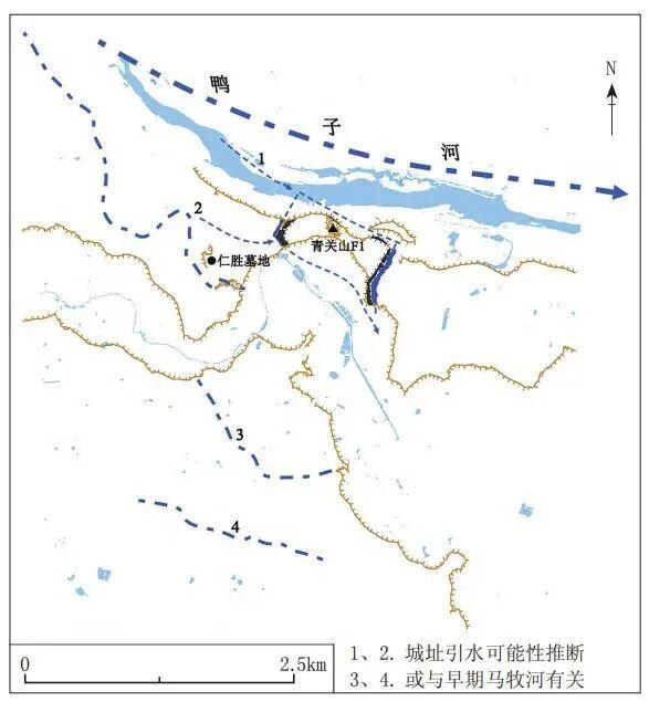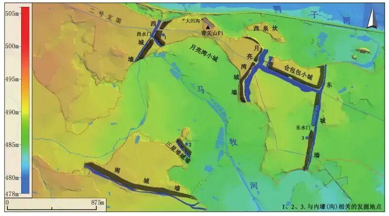 另外,在月亮湾小城内部,青关山城墙南侧“大凹沟”构成的内壕以及西城墙内侧的积水区(亦可能构成内壕),不仅加强了城内的蓄水和输排水能力,还为构筑城市景观(如池苑等)提供了便利。二者环绕在青关山台地的外围,或还发挥了防护、界隔功能,并且凸显了青关山高等级建筑分布区在城中的核心地位。
