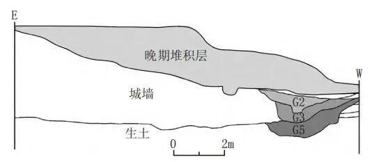 类似的现象在三星堆城墙内侧亦有发现。考古工作者早年曾在三星堆城墙内侧发现有与墙体平行的沟槽(图五,2),并且整个发掘地点的文化堆积均朝城墙所在方向倾斜,靠近城墙的探方地层堆积中还见有纯净的“间歇层”[25],暗示三星堆城墙内侧应有较大规模的壕沟。而“间歇层”的存在则代表了较强的水动力过程,或与洪水事件的发生有关。除此以外,部分城墙内侧虽无大型壕沟(如三星堆东城墙),但也存在开挖沟槽以便于排除积水的现象(图五,3;图六)[26]。
