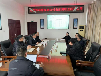 调研组一行在汉州街道召开工作座谈会,广汉市经普办汇报全市五经普推进情况,汉州街道汇报基层登记情况,会议研判了目前存在的问题及提出具体解决办法,安排部署下步工作要点。