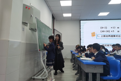 活动中,广汉市第四小学周滟函老师执教《两位数乘两位数》,她将数学思想、数形结合、自主探究等融合一起,通过创设情境,如三星堆、红领巾讲解员等,引导学生感受数学与生活的联系,并通过转化思想,新旧知识结合的方式,帮助学生理解算理和算法。广汉市第一小学李雷娟老师执教四年级下册第三单元《乘法分配律》,她引导学生通过多元表征把握规律内涵,理解数学模型,接着让学生举例验证、抽象概括,逐步完善建构数学模型,最后串联知识体系来内化提升数学模型。学生在进一步熟悉乘法分配律的同时,也积累了建模的经验。培养了抽象能力和思想,学生的学实现了“真生长”