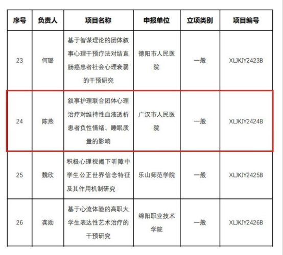 近日,由四川省心理健康教育研究中心传来消息,广汉市人民医院科研项目《叙事护理联合团体心理治疗对维持性血液透析患者负性情绪、睡眠质量的影响》经过审查、评审等程序被四川省心理健康教育研究中心确定为“2024年度立项项目”,并获项目专项资金3000元。