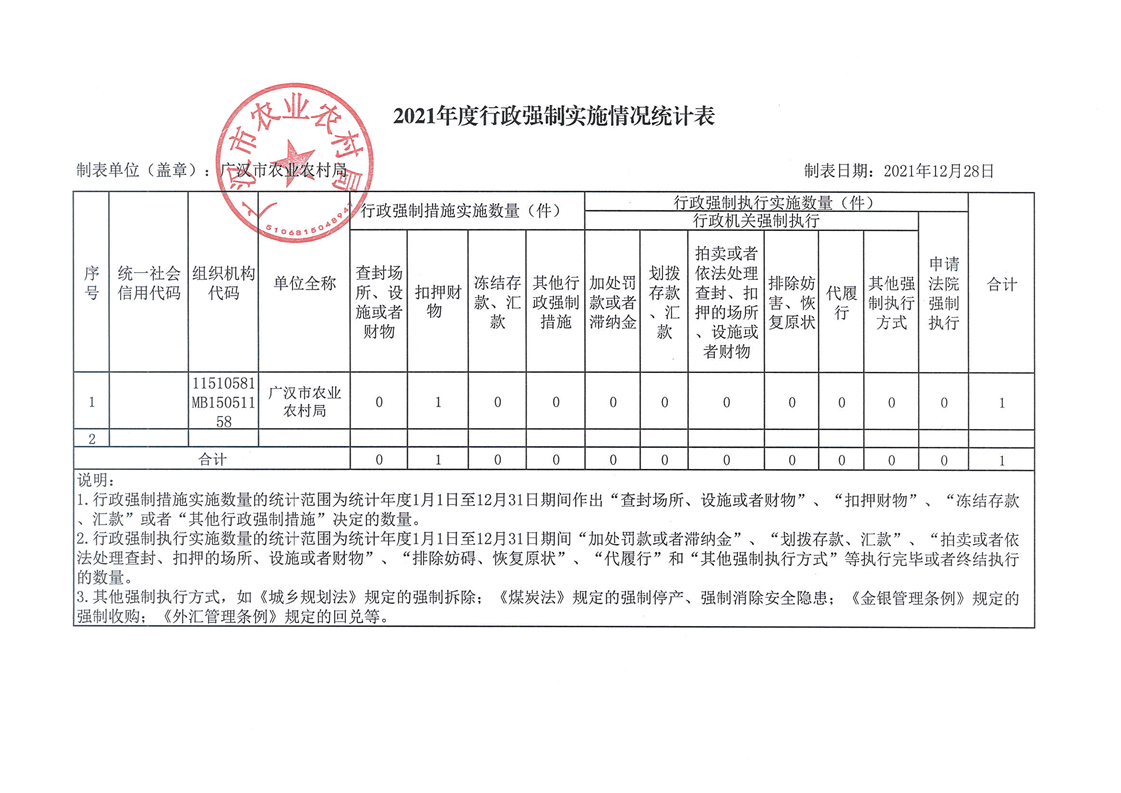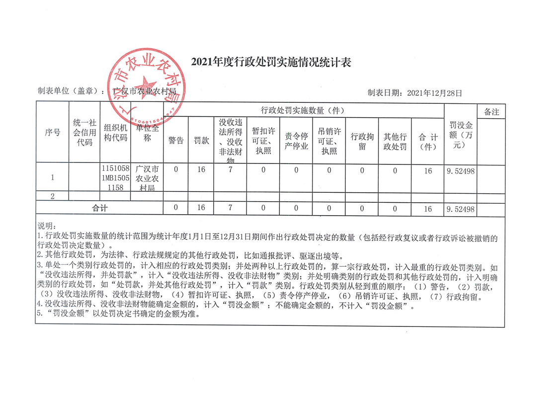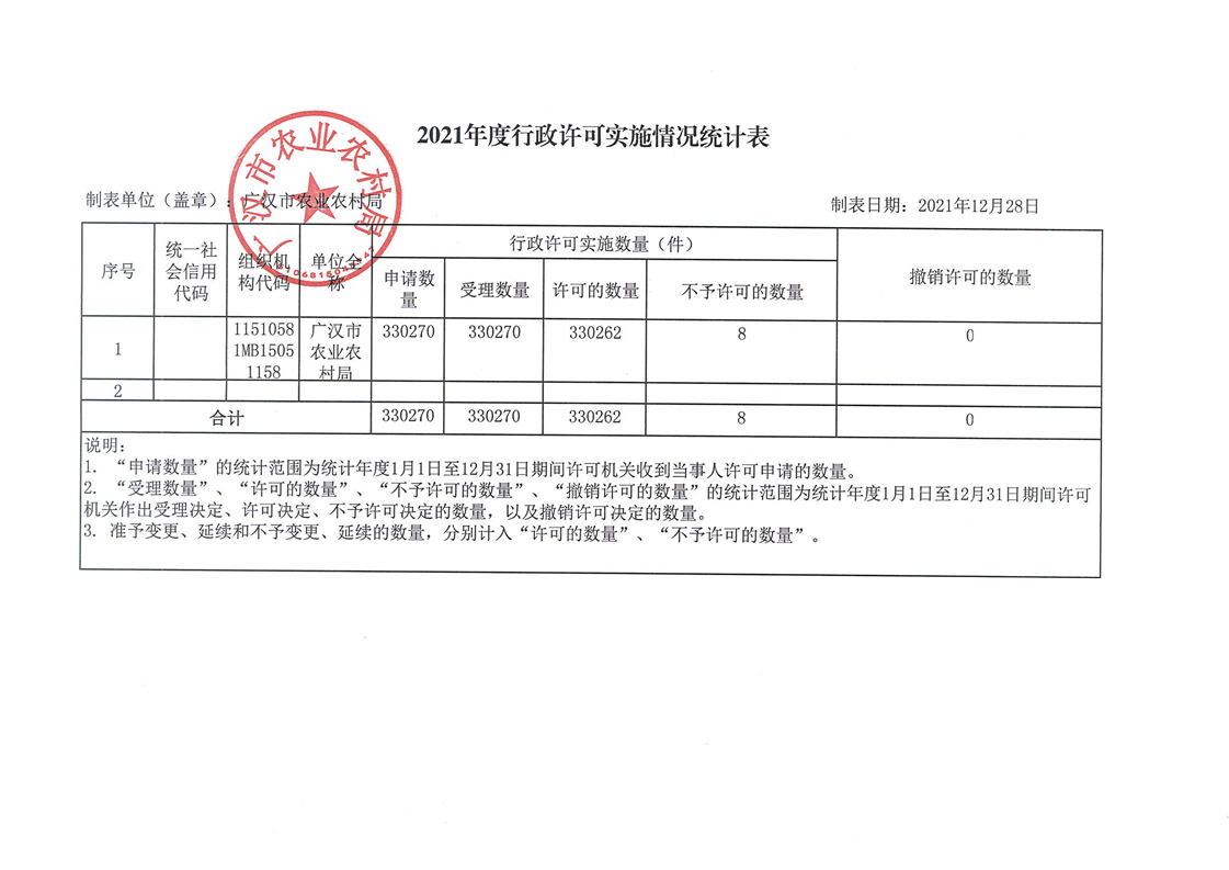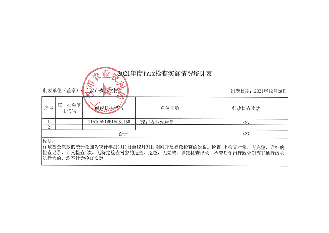 广汉市农业农村局2021年度行政许可、行政处罚、行政强制、行政检查实施情况统计表