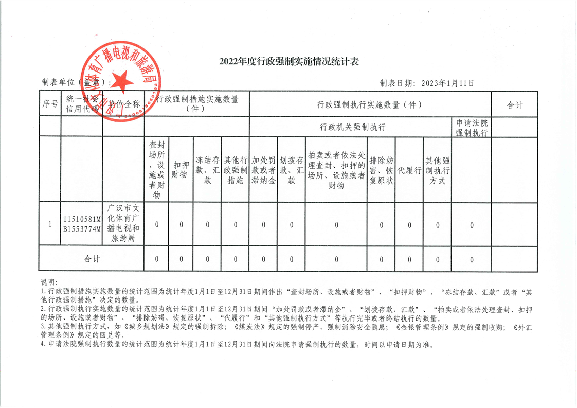 广汉市文体旅游局2022年度行政强制实施情况统计表